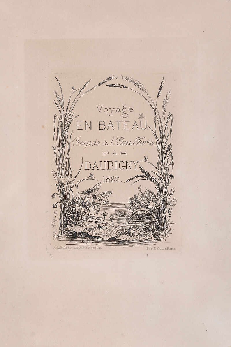 For his frontispiece for the series "Voyage en bateau," devoted to anecdotes about life aboard his floating studio, Daubigny chose to focus on the flora and fauna one might find along the river's edge. Tall reeds frame the title, while frogs chase insects among the waterlilies below. Two preparatory drawings in the collection reveal how Daubigny progressed with his composition to arrive at this final design (2018.11.1 and (2018.11.2).