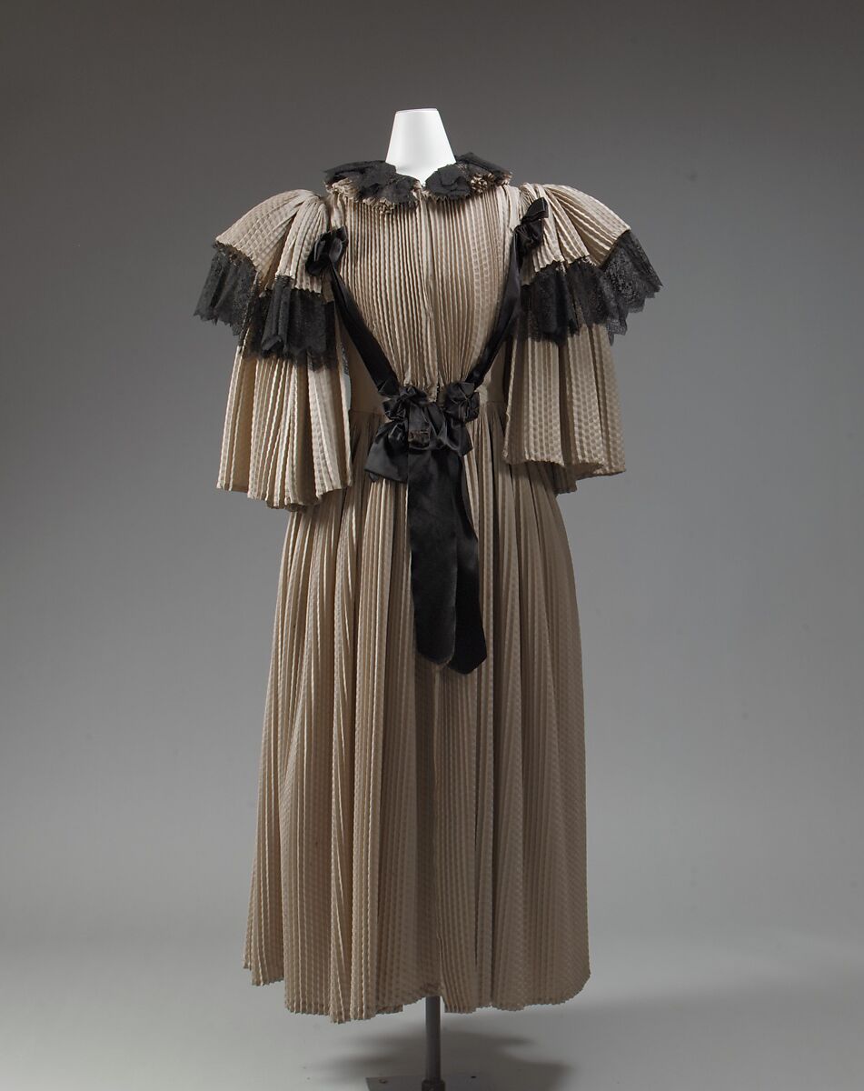 A form of negilgée, this wrapper is related to the highly elaborated teagowns which became fashionable at-home wear during the last quarter of the nineteenth century. As the vogue for teagowns took hold, they became less like dressing gowns and more like evening dress, even as, in the opposite direction, evening dresses began to take on more of the frothy embellishments of teagowns. The elaborate finish and ornament of this wrapper reflects the ambiguity of this merging of the decorative effects of eveningwear and intimate apparel.