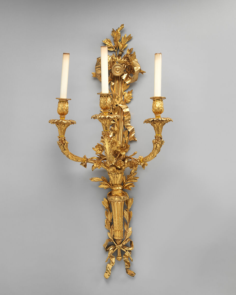 These wall lights, consisting of a set of six [see also 1979.172.11–.14], are made of chased and gilded bronze and epitomize the neo-classical style prevalent at the time. The back plate of each wall light is surmounted by a ribbon from which the bracket seems to be suspended, tied in a bow knot around a large nail at the top. Two laurel sprays are entwined around this ribbon, their ends tied in another bow knot at the lower end of the stem. Three curved candle branches spring from an acanthus leaf spray also fitted with a bouquet of flowers. The branches terminate in candleholders in the shape of leaf cups The circular tapered lower part stem takes the form of a fluted torch.
