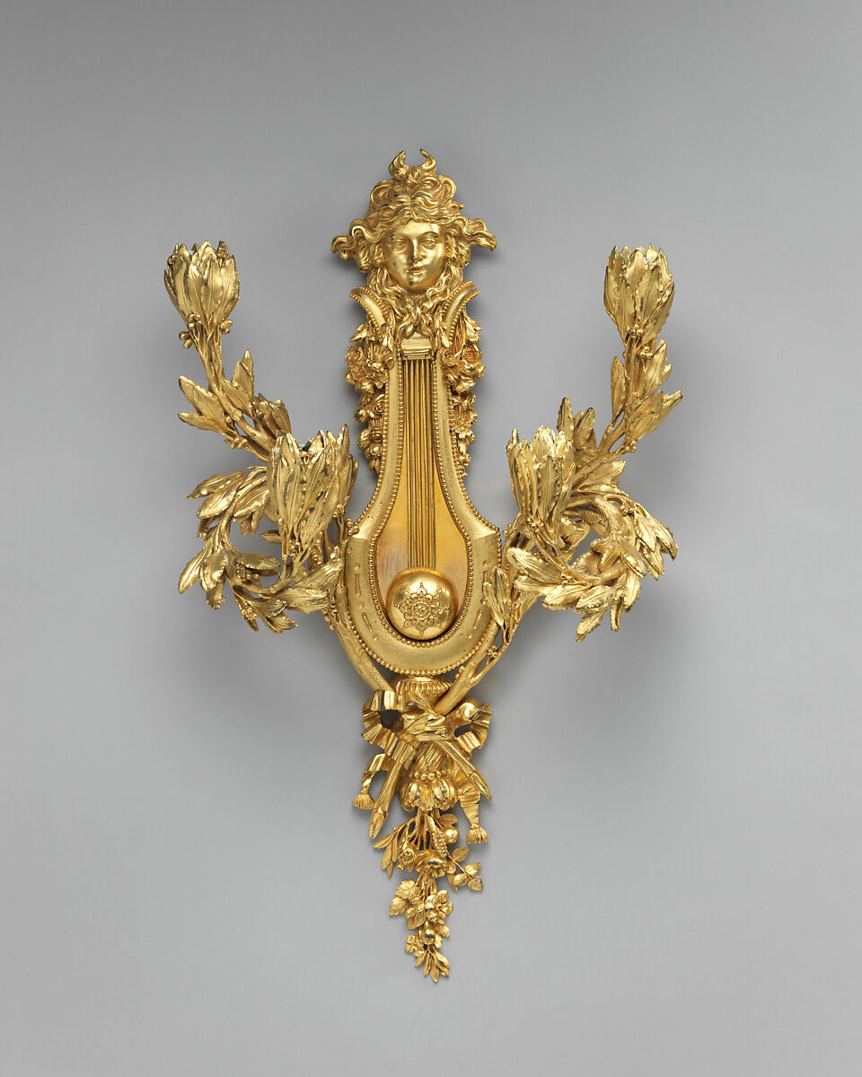 The celebrated bronze worker Pierre Gouthière supplied a pair of wall lights in the form of a lyre with the head of Apollo and olive-leaf branches for the salon of the Duchess of Mazarin. Sold at auction in 1781, the pair was acquired by the Duchess of Mazarin’s daughter, Louise-Félicité-Victoire d’Aumont, Duchess of Valentinois. The model was very successful and was frequently reproduced but with some changes such as this set which is based on Gouthière’s design but is smaller in size.