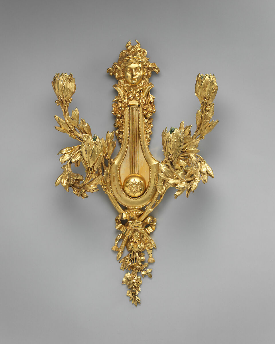 The celebrated bronze worker Pierre Gouthière supplied a pair of wall lights in the form of a lyre with the head of Apollo and olive-leaf branches for the salon of the Duchess of Mazarin. Sold at auction in 1781, the pair was acquired by the Duchess of Mazarin’s daughter, Louise-Félicité-Victoire d’Aumont, Duchess of Valentinois. The model was very successful and was frequently reproduced but with some changes such as this set which is based on Gouthière’s design but is smaller in size.