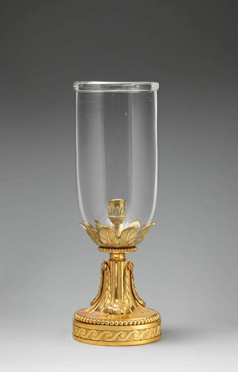 The glass shades would prevent the candle from being extinguished in a draft and these so-called hurricane lamps were, therefore, not only decorative but also highly practical. The Vitruvian scrolls and laurel leaf swags are typical for the Neoclassical style fashionable during the Louis XVI period.