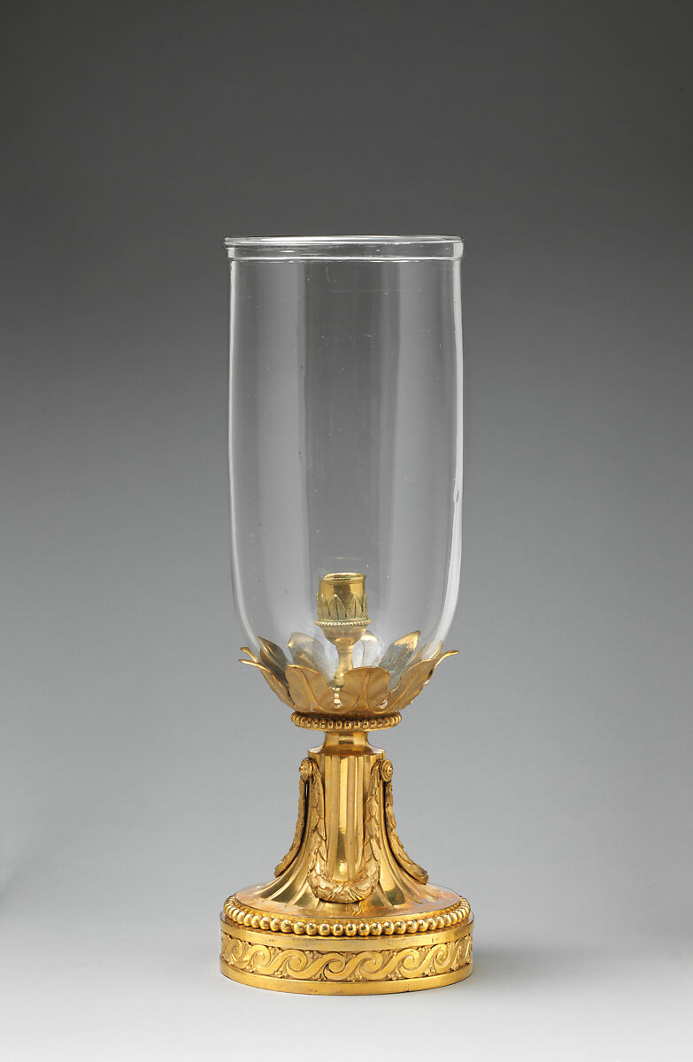 The glass shades would prevent the candle from being extinguished in a draft and these so-called hurricane lamps were, therefore, not only decorative but also highly practical. The Vitruvian scrolls and laurel leaf swags are typical for the Neoclassical style fashionable during the Louis XVI period.