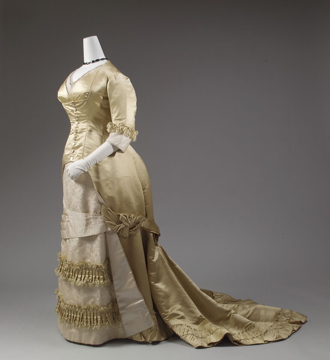 With mechanized sewing becoming ubiquitous, as well as the Victorian penchant for machine-made trimmings such as braid, lace, and ribbons, women's dress became the foundation on which elaborate surface decoration was applied. This example was seen in its day as à la sirène, or mermaidlike, in outline. Its extended bodice, called the "cuirasse" since it encased a woman's torso like body armor, was the clearest nineteenth-century expression of the hourglass shape.
