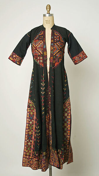 Many designs and motifs featured on Syrian clothing are important indicators of local cultural, social, and probably religious identity. This coat, composed of black cotton with colorful silk thread embroidery, is most likely from the rural areas of Syria. The garment is open down the front and slightly fitted. It features traditional designs among bold geometric designs, including a diamond-shaped medallion on the wearer’s chest. Floral patterns and stylized trees represent the tree of life motif or bold oval medallions on the garment’s front. Typical for Syrian embroidered coats from northern Syria are the diverse range of colors of embroidered stitches – red, yellow, green, blue, purple, or orange – and a preference for geometric motifs such as zigzags or lozenges. On the front is a large diamond medallion design that would cover the chest part of the wearer.