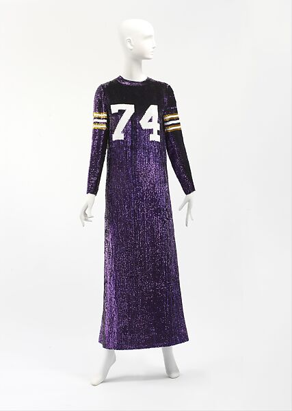 In the spirit of Pop art, Geoffrey Beene transformed the familiar form of the football jersey into a striking 1960s evening dress, floor length and encrusted with sequins. Appropriating the imagery of popular culture, Beene elevated the everyday by working with opulent embellishments traditionally reserved for evening wear while retaining the relaxed silhouette and strong color combination of his source, a Minnesota Vikings jersey.