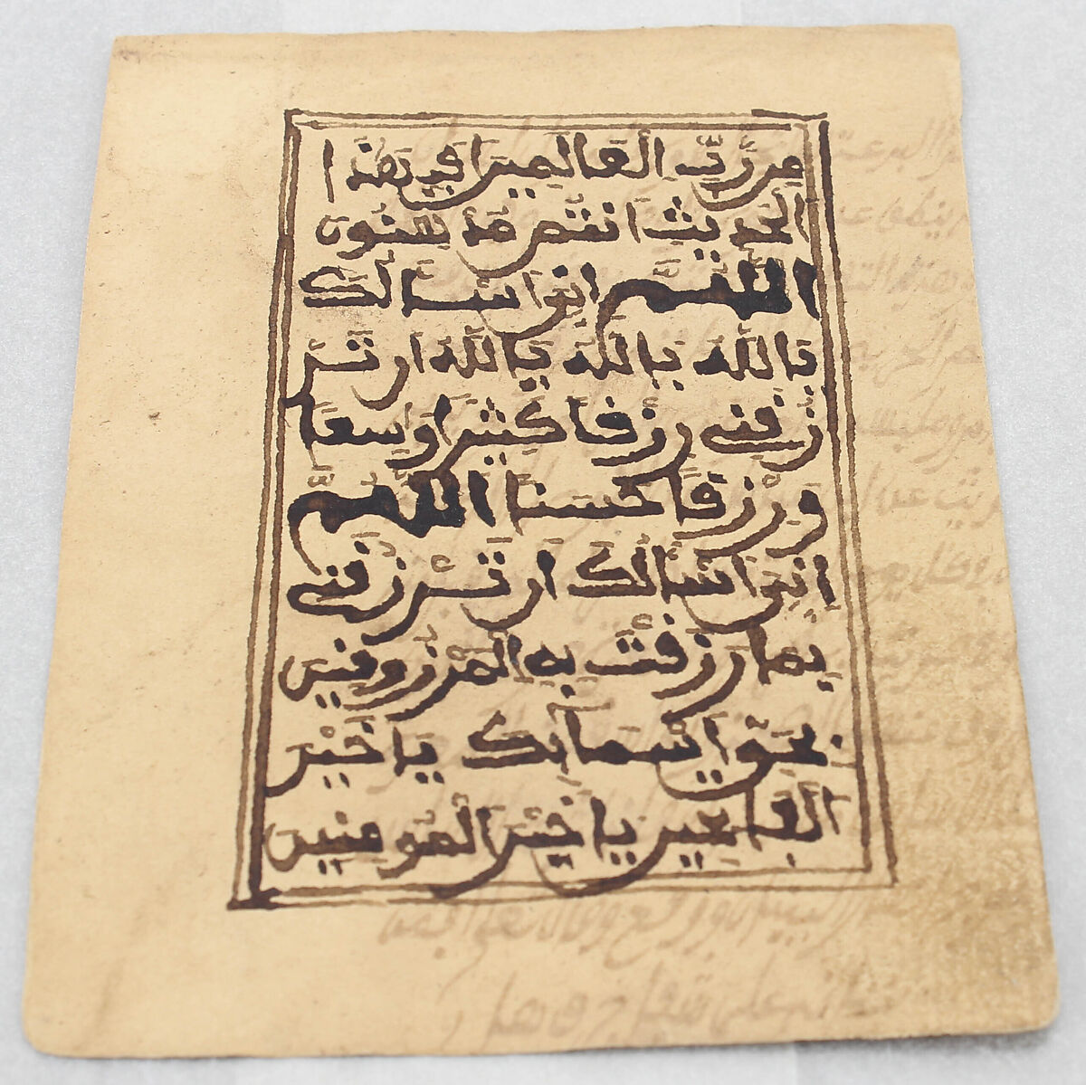 Written in fully vocalized maghribi script, this folio is noted for its thick strokes and rough execution, which suggests that it was possibly intended for a popular reader. The text is likely a prayer with the word "allahum" written in bold on lines 3 and 6. The bold writing calls for the reader/reciter to emphasize the word and project his voice while enunciating it. The style and manner of rendition are characteristic of later texts from North Africa.