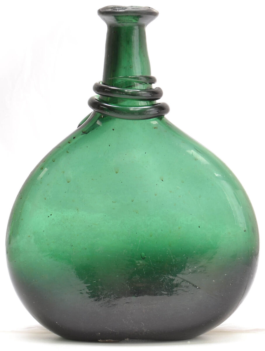 Thick glass bottles such as this example were used for transporting liquids across distances. The thickness of the body rendered them sturdy and virtually unbreakable. A unique feature of such bottles is that they were not intended to stand on a surface but were packed, perhaps in saddle bags, and carried on the back of an animal such as a camel, horse or a donkey.