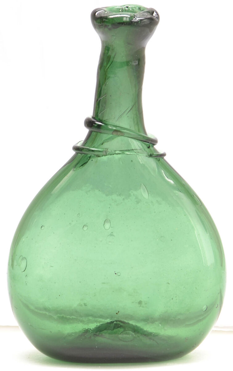 Thick glass bottles such as this example were used for transporting liquids across distances. The thickness of the body rendered them sturdy and virtually unbreakable. A unique feature of such bottles is that they were not intended to stand on a surface but were packed, perhaps in saddle bags, and carried on the back of an animal such as a camel, horse or a donkey.