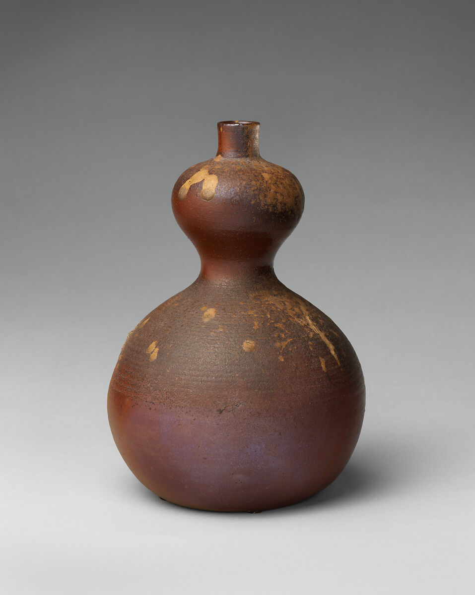 This sake bottle in the shape of a double gourd is an example of Bizen ware, undecorated and unglazed save for the speckles and drips of natural ash glaze, created during the firing process, that appear mainly on the upper portion of the piece. The dark reddish-brown clay and the fire-marks typical of Bizen ware can be seen on the lower section of the body.