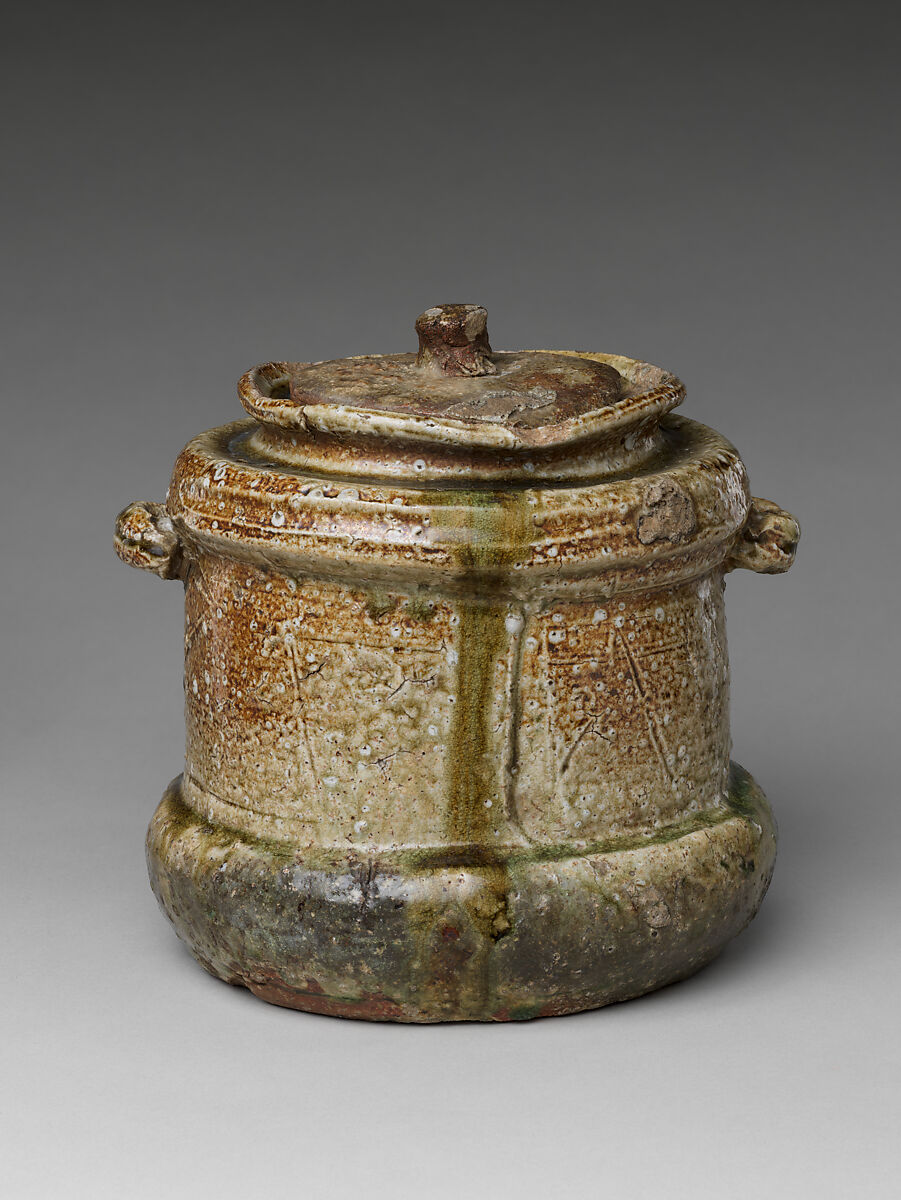 The first object to enter the tearoom at the commencement of a tea gathering, the mizusashi, replenishes the kettle. It maintains a prominent position in the tearoom for the duration of the ceremony and, therefore, plays a key role in the toriawase, the tea master’s deliberate selection and combination of utensils that make each tea gathering a unique event. This freshwater jar epitomizes the “perfect imperfection” aesthetic admired by masters of Japanese tea during the 1500s. The potter left the marks of his hands and fingers as he created the form on the wheel and made incisions in the surface. The long firing process in a wood-fired kiln further deformed the vessel and left scorch marks and cracks that interact visually with the vitreous green natural ash glaze.