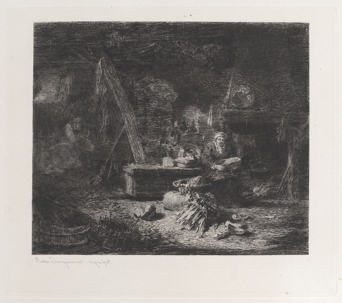 The murky darkness of Kalf’s "Interior of a Kitchen" (71.69) posed a challenge to Jacquemart, who made this etching after it for a portfolio of prints celebrating the founding collection of the Metropolitan Museum of Art. In his review of the plate, the British critic Philip Gilbert Hamerton called it "one of the cleverest in the whole set" and noted the care the etcher had taken to "make things clear just to the degree which the painter intended, and no further." Today the print reveals more of the composition than is visible in the painting, which has likely darkened over time.