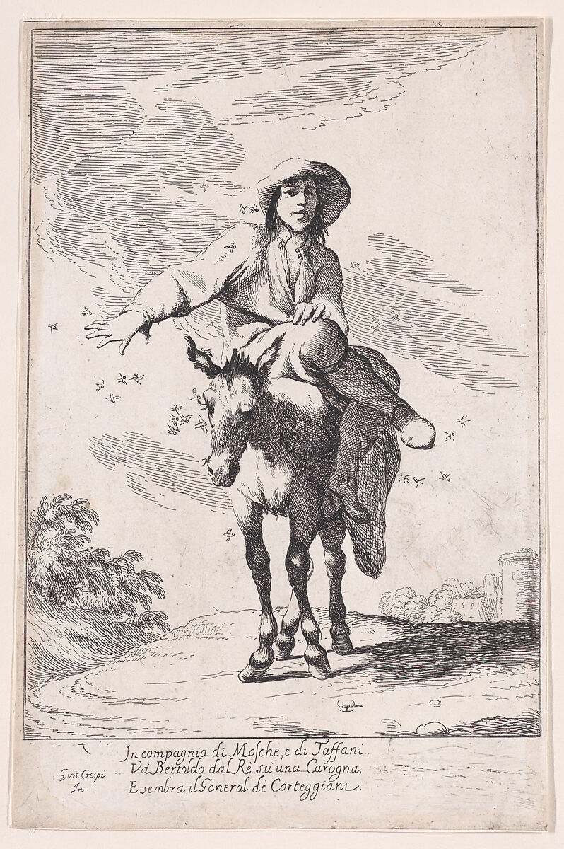 - Title: Plate 1: Bertoldo riding a donkey, from "Bertoldo, Bertoldino, and Cacasenno"