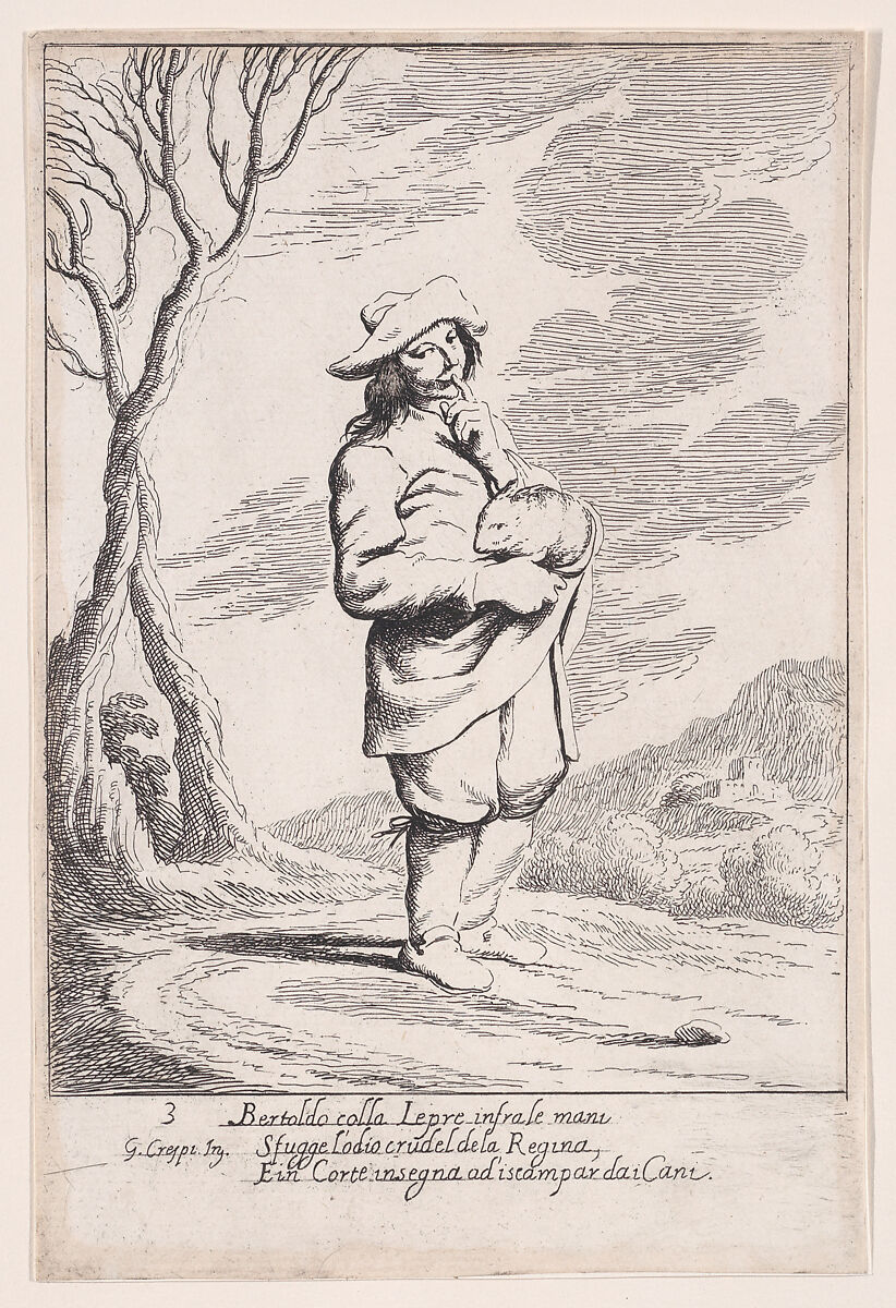 - Title: Plate 3: Bertoldo holding a hare in his hand, from "Bertoldo, Bertoldino, and Cacasenno"