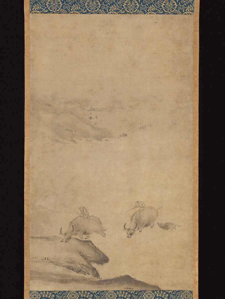 A pair of water buffalo, followed by a calf, wade through shallow water, their herdboys perched on their backs. They are likely returning home after a day in the rice paddies, where, in China, water buffalo were used to draw plows. Associated in China with agriculture, fertility, and the spring season, herdboys and buffalo were also the subject of a Zen parable, "Ten Verses on Oxherding." Composed in eleventh-century China, it compares the herding of an ox with the individual’s search for enlightenment, which each person inherently has potential to attain, presented in ten phases. The theme was popular in China from the Song dynasty onward and was brought to Japan by the Kamakura period, when it became a popular subject for Zen ink painters.