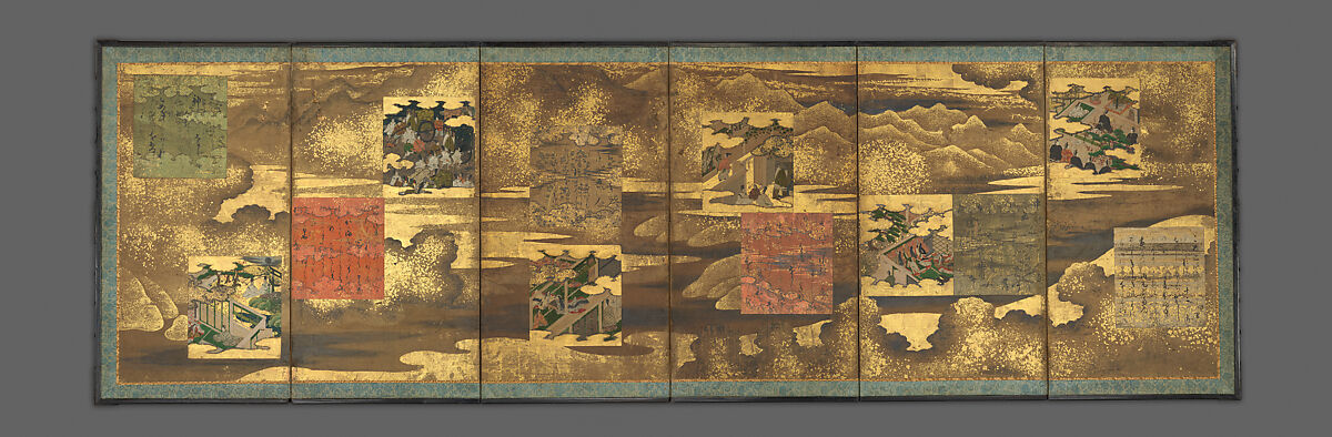 This pair of screens illustrates scenes from The Tale of Genji, the monumental eleventh-century classic by the court lady Murasaki Shikibu. The paintings, produced by an artist or artists of the Tosa school, are affixed to the screen panels at different heights, as are the shikishi of decorated paper upon which passages from the tale are inscribed, predominantly in kana. This format was not unusual for a set of Genji screens; what distinguishes this example is the spectacular continuous landscape of mountains, clouds, and water rendered mostly in shades of gold—with sprinkled gold powder and flakes as well as silver leaf. This gorgeous backdrop conjures up the court culture of the Heian period (794–1185), while the calligraphy reflects Momoyama-period (1573–1615) styles.