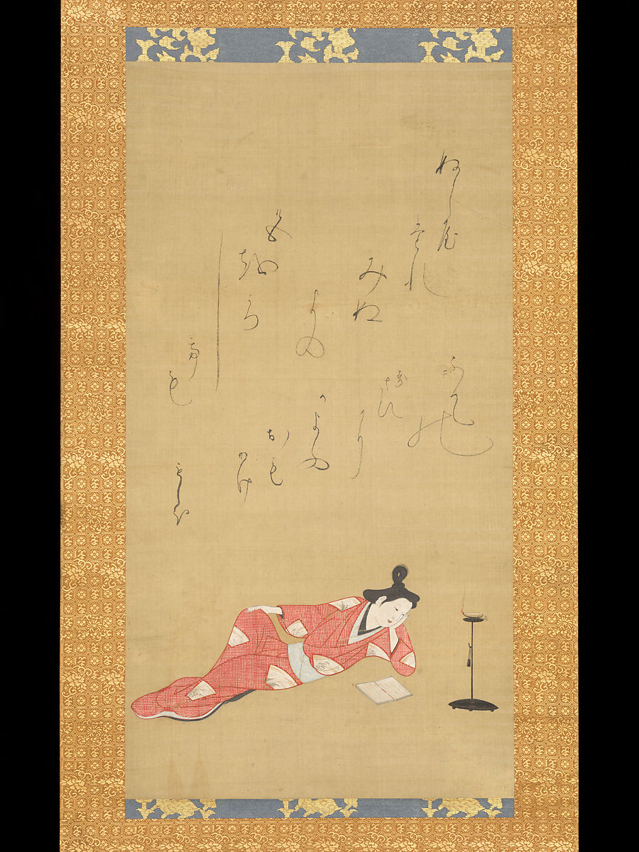 This young woman, her hair twisted up into a modified “palace-style” looped chignon (gosho-fū), lies in a pensive pose with her head propped on one hand. By the light of a single lamp, she reads a book that is open on the floor before her. The poem, inscribed in kana using the scattered-writing (chirashi-gaki) mode, is signed Moshio—a courtesan in the Shimabara pleasure quarters in Kyoto.