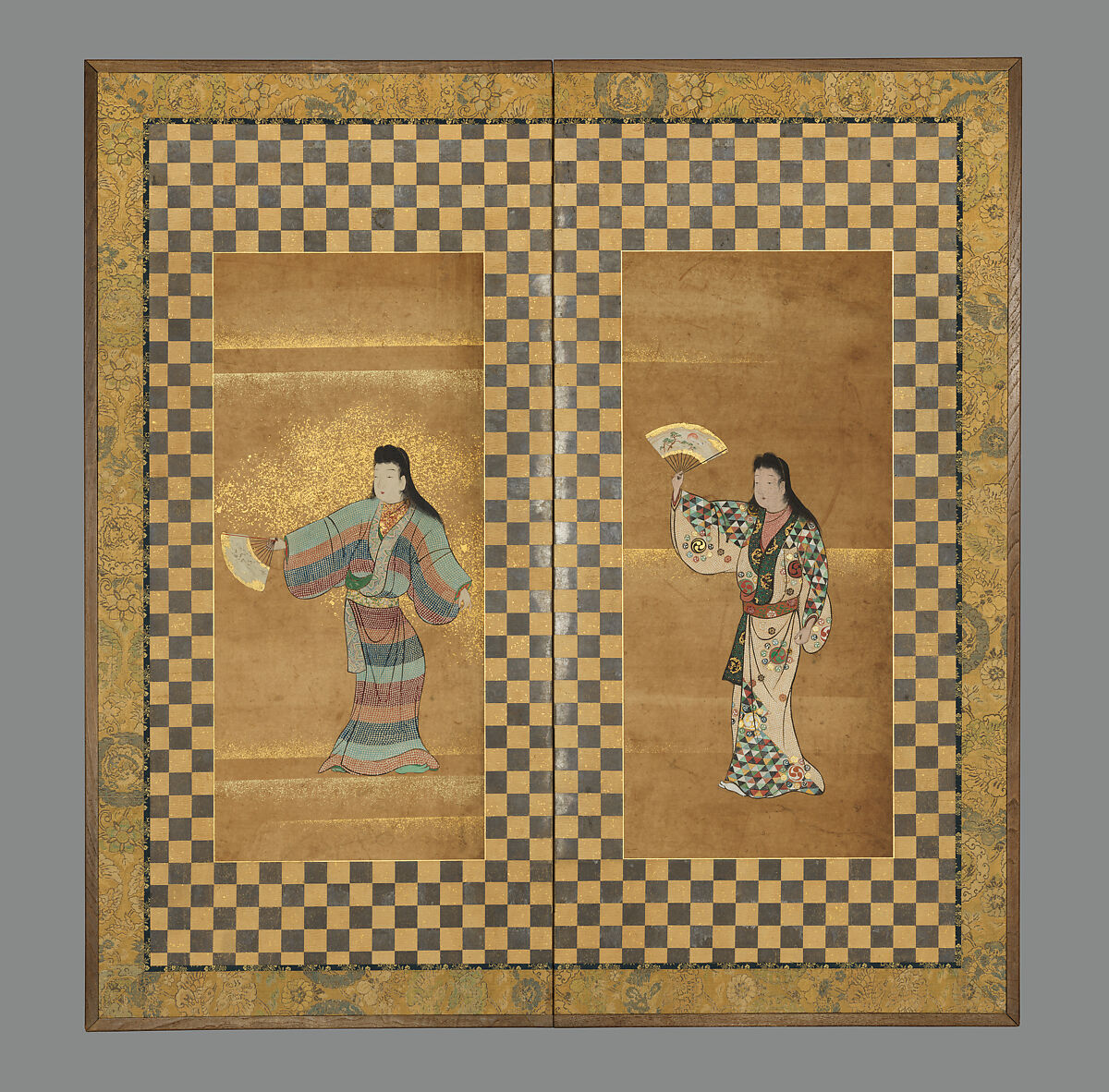 Against a blank background sprinkled with gold, two female figures move in rhythmic dance poses and gestures with their opened folding fans. Both wear elaborately patterned "small sleeve" kimonos (kosode), in rich colors with flourishes of gold. Screen paintings such as this, often in the format of six-panel folding screens, evidenced the growing popularity of new forms of dance in the Edo period, and an interest in exhibiting the latest trends in women’s fashions. Early examples of this genre appeared in the early seventeenth century, but this example, from perhaps a century later, preserves the format of the earlier works. Such screen paintings also reflected the trend, in hanging-scroll paintings by ukiyo-e artists, of focusing attention on a single figure posed in stylish and elegant attire.