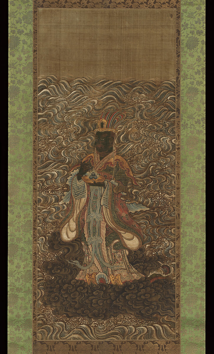 A crowned figure wearing a Chinese robe and holding three wish-fulfilling jewels stands on a dark, curling cloud, which in turn rests on the surface of a wave-roiled sea. The deity can be associated with Nagaraja, mythological snake or dragon kings from India’s Vedic tradition that were brought from China to Japan along with other gods incorporated into the Buddhist pantheon. He likely represents Suiten, the Buddhist version of Varuna, a Hindu god of water, a bringer of rain, and ruler of the Naga deities. In Japan, Suiten was also associated with water and was thus seen as a guardian deity for fishing, seafaring, and even the so-called “water trade,” or business of the pleasure quarter.
