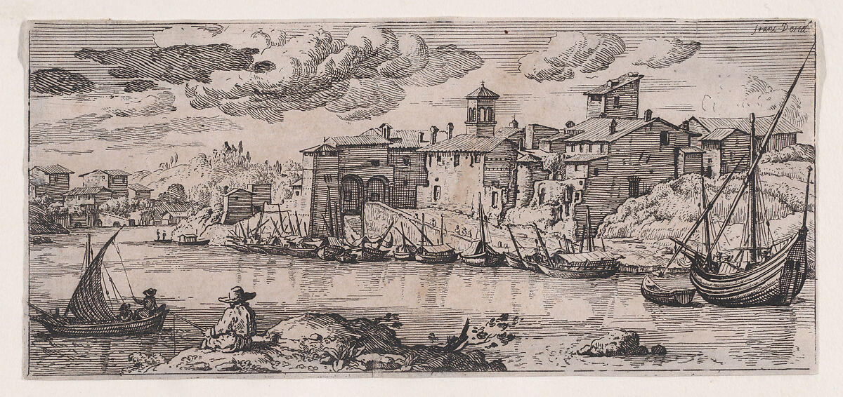 - Title: Fishermen on a river across from a town