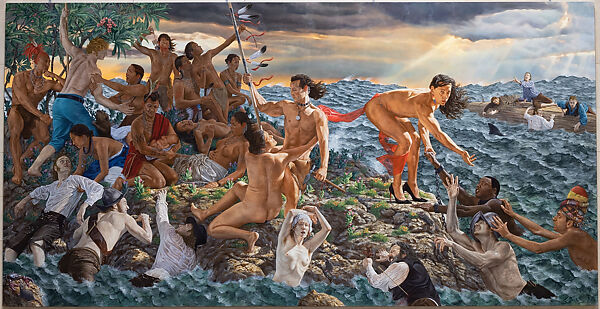 Commissioned by The Met in 2019, Monkman’s mistikôsiwak: Wooden Boat People is a diptych consisting of Welcoming the Newcomers and Resurgence of the People (MMA 2020.216b), two monumental figurative paintings painted in a grand, highly detailed style recalling nineteenth-century academic painting. The commission’s primary title derives from a Cree word meaning "wooden boat people," which originally applied specifically to French settlers, but here it refers to all Europeans who colonized land known now as North America. Welcoming the Newcomers dramatically recreates their arrival, bringing with them institutions of religion and slavery. Resurgence of the People is a testament to, and celebration of, Indigenous resiliency. Monkman's shape-shifting, time-traveling alter ego, Miss Chief Eagle Testickle, appears prominently in both paintings, personifying Cree values and embodying the Indigenous Two Spirit tradition, which embraced a third gender and nonbinary sexuality. Monkman’s imagery teems with references to works in The Met collection, especially subjects relating to the Romantic myth of the "Vanishing Race," such as Eugène Delacroix’s The Natchez (1989.328) and Thomas Crawford’s Mexican Girl Dying (97.13.2a–e). Reversing the colonial gaze of European and American art history, the artist’s approach subverts these dark, deadly narratives.