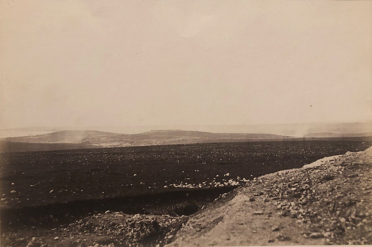 Fenton’s extensive documentation of the Crimean War—the first use of photography for that purpose—was a commercial endeavor that did not include pictures of battle, the wounded, or the dead. His unprepossessing view of a vast rocky valley instead discloses, in the distance, a site of crucial strategic importance. Fort Malakoff, the general designation of Russian fortifications on two hills (Mamelon and Malakoff) is just perceptible at the horizon line. Malakoff’s capture by the French in September 1855, five months after Fenton made this photograph, ended the eleven-month siege of Sevastopol and was the final episode of the war.