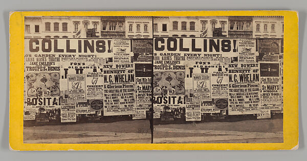 This work of art is currently on loan to the museum.Benefit concerts, minstrel shows, lectures, and horse races all clamor for attention in this graphic field of broadsides posted in the Bowery neighborhood of Manhattan. The stereograph format lends added depth and dimensionality to the layered fragments of text, transporting viewers to a hectic city sidewalk. Published for a national market, the scene indexes a precise moment in the summer of 1863, offering armchair tourists an inadvertent trend report on downtown cultural life.