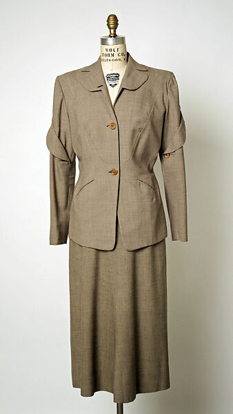 In an act of postwar revelry, Adrian produced extravagant suits featuring multiple collars, revers, and pockets. One jacket possesses a generous collar and features extra revers with buttons that migrate to the sleeve in a faintly surrealistic transposition. The boxy coat reveals a multitude of pockets, both functional and decorative, angled and disposed with Adrian's signature idiosyncratic whimsy.