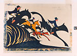 While Andrews made many images of the city, she, like other Grosvenor School artists, also created numerous prints of athletic events and other physically challenging endeavors in rural environments, with a particular focus on equestrian activities such as steeplechases and hunts. Andrews reinvented this traditional genre by applying a machinelike aesthetic to it (perhaps inspired by her work as a welder in an airplane factory during World War I), thus enabling her to convey the same sense of motion and power found in her other works. The velocity and potential for danger that she captures with motorbikes in Speedway (1934), for instance, are also present here, in a work depicting riders mounted on horses in mid-jump, following hunting dogs likely in pursuit of a fox. This linocut, titled In Full Cry, is part of a group that was recently acquired from Leslie and Johanna Garfield.