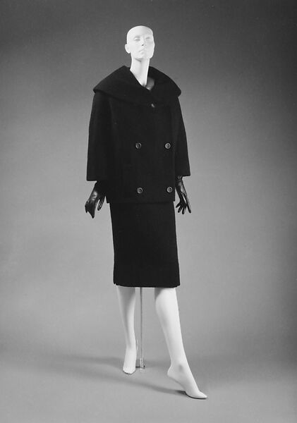 With this ensemble, Dior posed a layered repudiation of his own New Look silhouette. The coat, of an exaggerated blockiness, was to be worn over a tubular dress that ignored the waist and barely acknowledged the bust and hipline. A decade after his innovation, Dior was resolutely denouncing the elements that for so long had constituted his work.