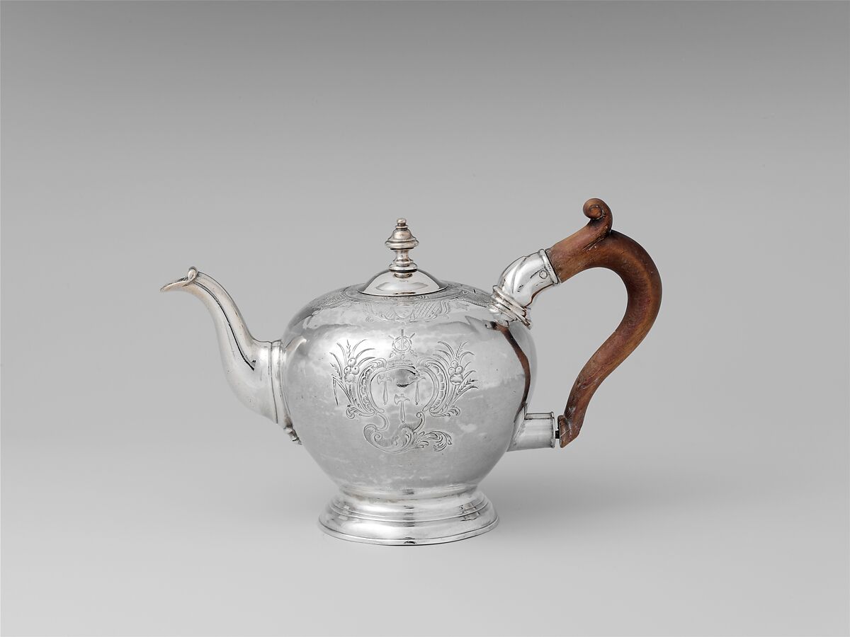 The arms on this teapot are those of the Gibbs family. Hannah Gibbs (1735–1762) was the daughter of Robert (d. 1769) and Amy (Whipple) Gibbs (b. 1697), and the great-granddaughter of Robert Gibbs who came from Warwickshire, England, to Boston about 1658 and became a wealthy merchant with a house on Fort Hill. Hannah Gibbs married Daniel Tillinghast in 1752, and this teapot is said to have belonged to one of their children.