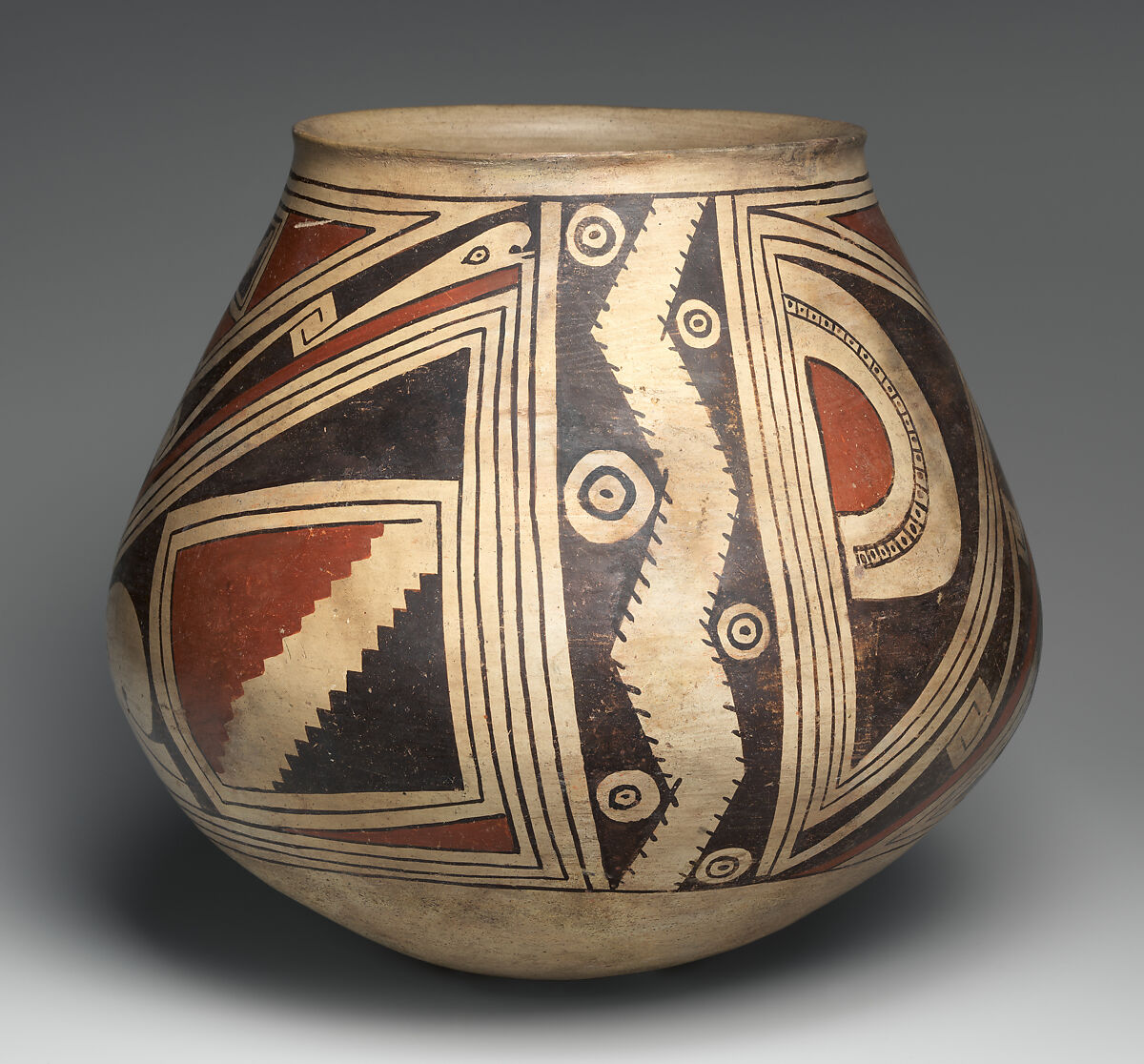 This striking jar (olla) features a geometric design with a stylized bird motif. Stylistically related to Casas Grandes, one of the largest and most complex Mogollon culture sites, this vessel corresponds to the Ramos Polychrome phase.