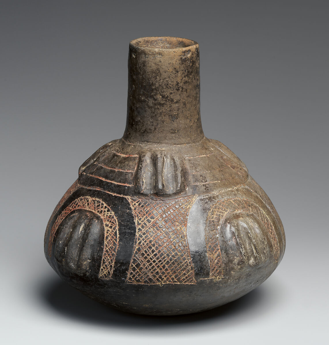 The separate, but related, cultural groups kuown as Ancestral Caddoan-a regional variant of the Mississippian culture-flourished in the southeast of what is now the United States in the centuries prior to European contact. Although fine ceramics are kuown from the region as early as AD 800, the distinctive engraved vessels with swirling and cross-hatched designs (sometimes called Friendship Engraved) emerged after A.D. 1400. This fine water bottle features applique work over an incised ground with traces of red hematite.