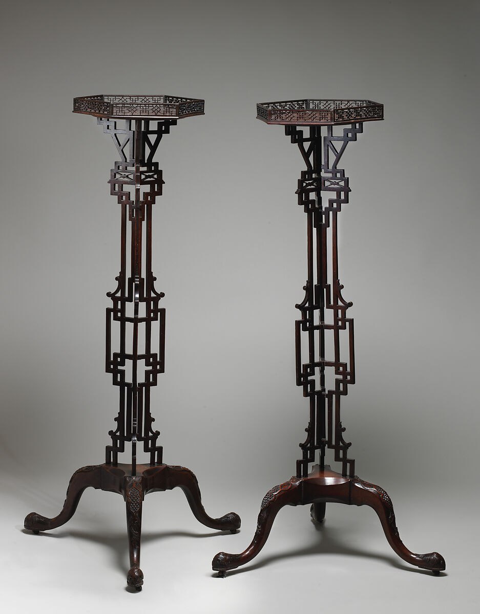 Chinese fretwork first appeared in England early in the eighteenth century in garden fenves, but it was not until mid-century that the vogue for fretwork on furniture erupted. The model of these candlestands is Plate CXX in the first edition of Thomas Chippendale’s Gentleman and Cabinet-Maker’s Director (1754).