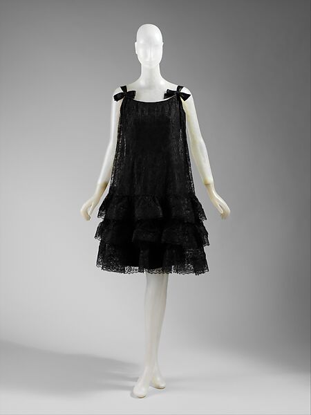 This short evening dress of black lace consists of three layers. The first layer is a built-in bra supported by six bones, two in front and back, one at each side. The second layer is a slip of cream-colored silk with a sheer black chiffon overlay. The slip is shaped like a sheath and has a wide band of lace at the hem. The outer layer consists of a loose-fitting baby-doll dress with a triple tier of ruffles on the skirt. The dress has a boat neckline, and shoulder straps of black satin ribbon finished in bows. There is a zipper closure at the left seam.