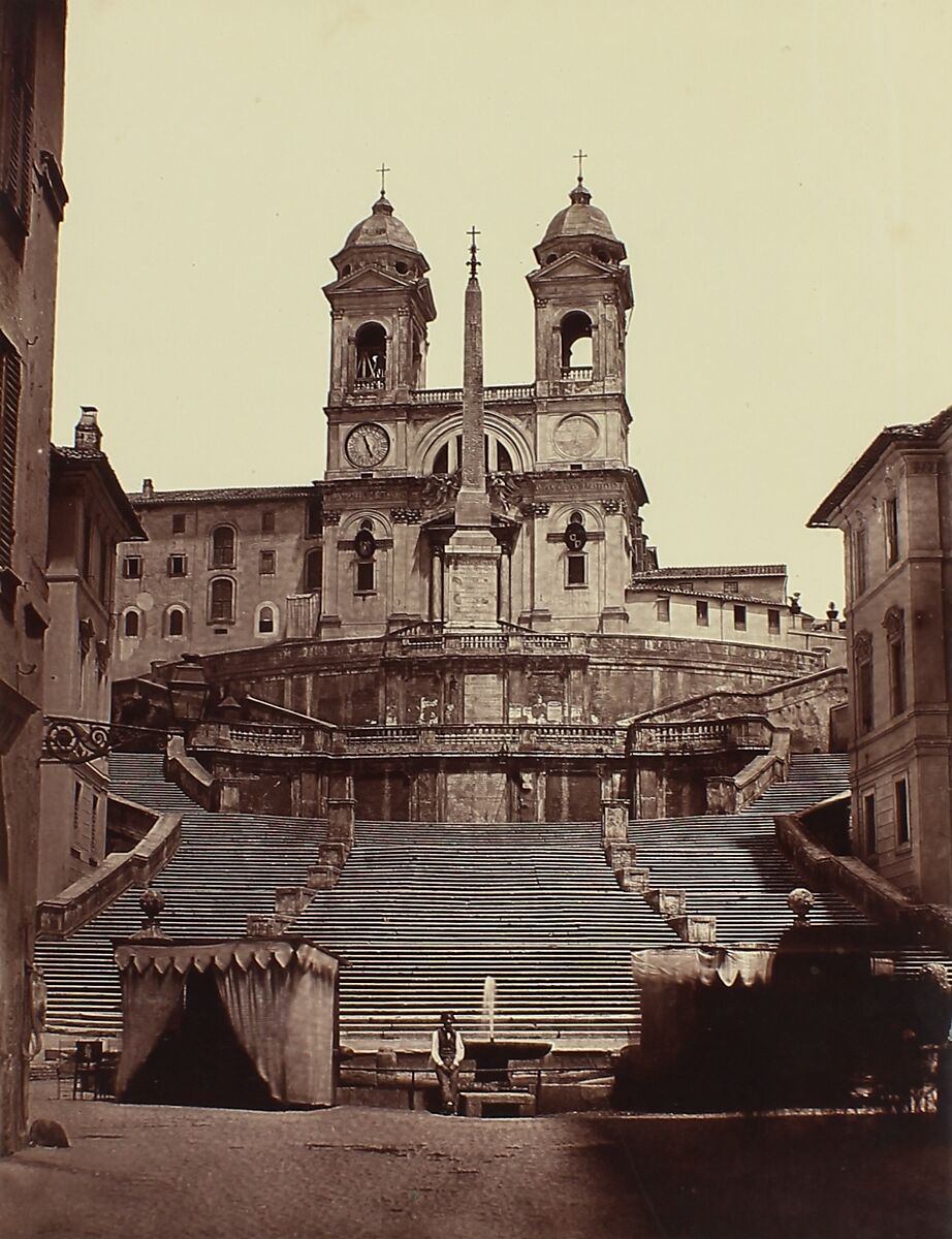 Made in late afternoon light, Pietro Dovizielli’s picture shows a long shadow cast onto Rome’s Piazza di Spagna that almost obscures one of the market stalls flanking the base of the famed Spanish Steps. Rising above the sea of stairs is the church of Trinità dei Monti, its facade neatly bisected by the Sallustiano obelisk. In the piazza, a lone figure—the only visible inhabitant of this eerily empty public square—rests against the railing of the Barcaccia fountain. Keenly composed pictures like this led reviewers of Dovizielli’s photographs to proclaim them "the very paragons of architectural photography."