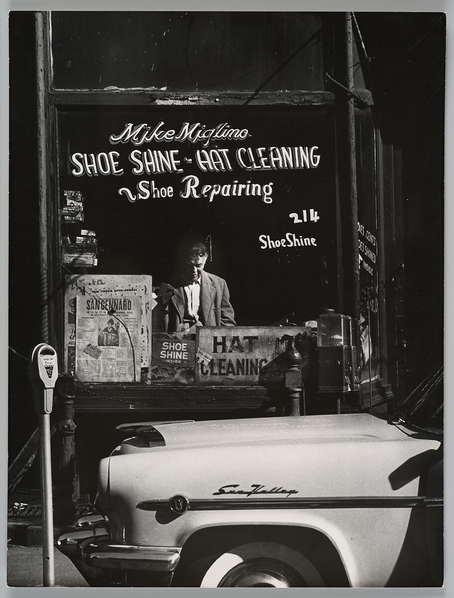 Mario De Biasi first visited New York in 1955 on a fashion assignment for the Italian press, and his impressions of the city are suffused with glamour. Dispatches home to his employer, the Milanese illustrated weekly Epoca, are nocturnes in neon and steel—departures from the seasoned photojournalist’s signature humanism. Even here in Little Italy, a sleek fender varnishes his view of a cobbler’s storefront, where hand-lettered signage mirrors the car’s chrome insignia. Of the many photographs De Biasi made on his trip, this is one of only a few to directly engage the Italian immigrant community in New York. Perhaps distancing himself from the regional neorealist school in which he made his name, the photographer may have been positioning his work for a broader audience.