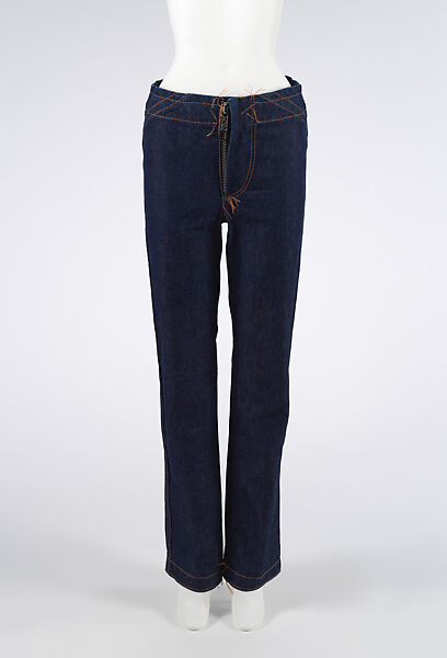 Martin Margiela's conceptual fall/winter 1994–95 collection was comprised of five groups of garments which introduced new codes to the Maison's DNA, based on replicas of existing garments, both of his own hand and of vintage garments. The third group of the collection was called "Clothing reproduced from a doll's wardrobe," and included this pair of denim trousers from the 1960s. The doll's garments were blown up to human size, keeping the disproportion of the doll's body, the garments and its closures intact. This conceptual direction in the oeuvre of Margiela introduced notions of the replica, the grotesque and deconstructed the idea of the perfect size or body type.