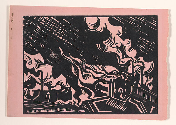 In 1918, Wadsworth made several trips through the Black Country while traveling between Liverpool and London. Located in England’s West Midlands section, the region received its name in the nineteenth century due to the soot from heavy industry and coal production that covered the area. Wadsworth was fascinated by the scale of manufacturing, especially the effects that its waste (such as slag heaps from coal and air pollution from factories) had on the environment. He printed this powerful scene of fiery iron and steel furnaces and polluted skies on different colored papers.