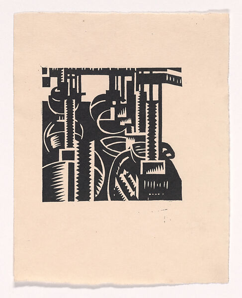 Unlike Wadsworth’s depictions of dazzle ships, in which he stressed the bold optical patterns of their contrasting black-and-white designs, Tugs consists of solid black forms interrupted by jagged white zigzags. Shapes are compressed and tightly cropped, producing a sense of disorientation. This compression, when combined with the sawtooth patterns found throughout the composition and the vertical stacks, among other related elements, recalls Wadsworth’s earlier work Newcastle and his evocation of mechanical parts made large to show the superhuman power of industrial machinery. Here, he applied the same precision and sense of force to wartime vessels.