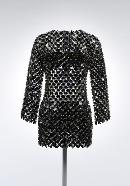 The Spanish-born French designer Paco Rabanne was a pioneer in his subversion of traditional couture techniques. Rabanne’s innovative design methodology utilized unconventional materials and frequently employed the use of interchangeable components as a general approach to garment construction. This dress from 1969, is composed from a series of black Rhodoid (or cellulose acetate) discs that have been linked together with hundreds of small metal jump rings, a type of hardware that is typically reserved for jewelry. Though the discs have been layered in bands across the breasts and hips in a gesture towards modesty, the abbreviated hemline, and the interstitial glimpses of skin that the garment exposes embody the period tendency to celebrate and display a youthful figure.