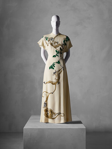 This work of art is currently on loan to the museum.Adrian was keenly aware of the potential that the runway provided long before he introduced his first fashion collection, in 1942. His clothing in the fanciful fashion show scene for the 1939 film The Women became an immediate inspiration to other designers, and his ability to develop a story, to enchant his audience, and—perhaps most importantly—to entertain, was always paramount. This paradigm easily transferred to his fashion shows and the environments he created for his salon, boutiques, and ad campaigns. His lifelong captivation with animals propelled him to bring live creatures onto the runway several times throughout his career, at least twice including monkeys that were accompanied by an organ grinder. This dress from his spring/summer 1950 collection is among a small group of designs that inspired this whimsical method of introduction and, accordingly, features a troop of vervet monkeys that climb both sides of the garment. Subtle construction touches, which attest to the quality that all his clothing exhibits, include irregular seams that swell to incorporate leaf motifs and preserve the painterly flourish of an extended paw.