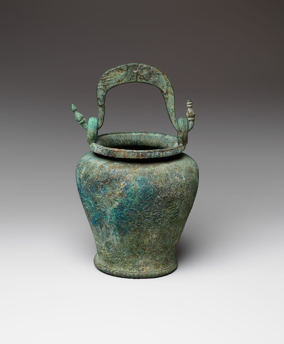 The decoration of the vessel, particularly the lively ornamentation evident in the adorsed palmettes and tongue pattern on the body, is characteristic of high quality Etruscan metalwork of the Classical period. The hole between two birds in the center of the handle is for the attachment of a chain, preserved on other examples.