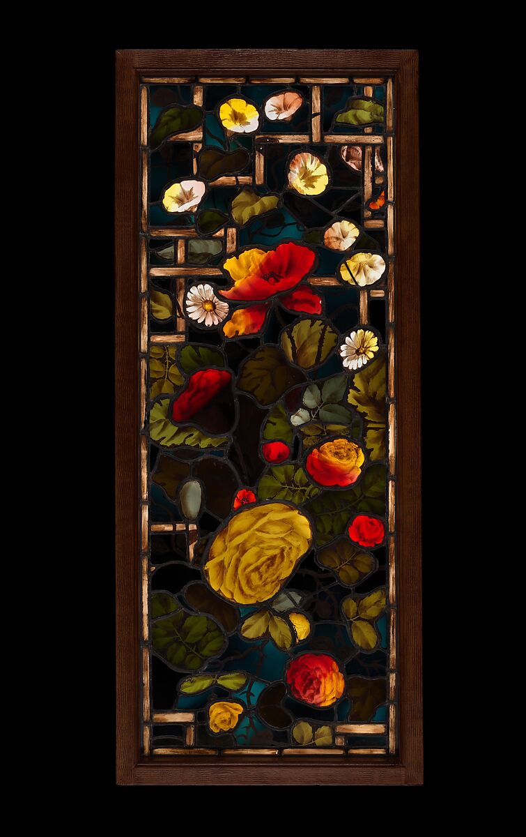 Cottier, like John La Farge, was among the first to introduce new floral subject matter to stained glass, epitomized by this window. The window relates closely to a three-panel window made for the Newport house of W. Watts Sherman in 1877-78, and now in the collection of the Museum of Fine Arts, Boston. This is a quintessential Aesthetic window: its subject matter—even the specific floral motifs selected (morning glories, marguerites, and peonies with foliage on a golden trellis); the palette of olive green foliage and deep peacock blue background; and the flat, decorative and asymmetrical composition on a bamboo lattice that connects it to the vogue for Japanese prints. It shows technical innovations in glass that was just becoming available in the blossoms that shade from a rich yellow to a deep rose.