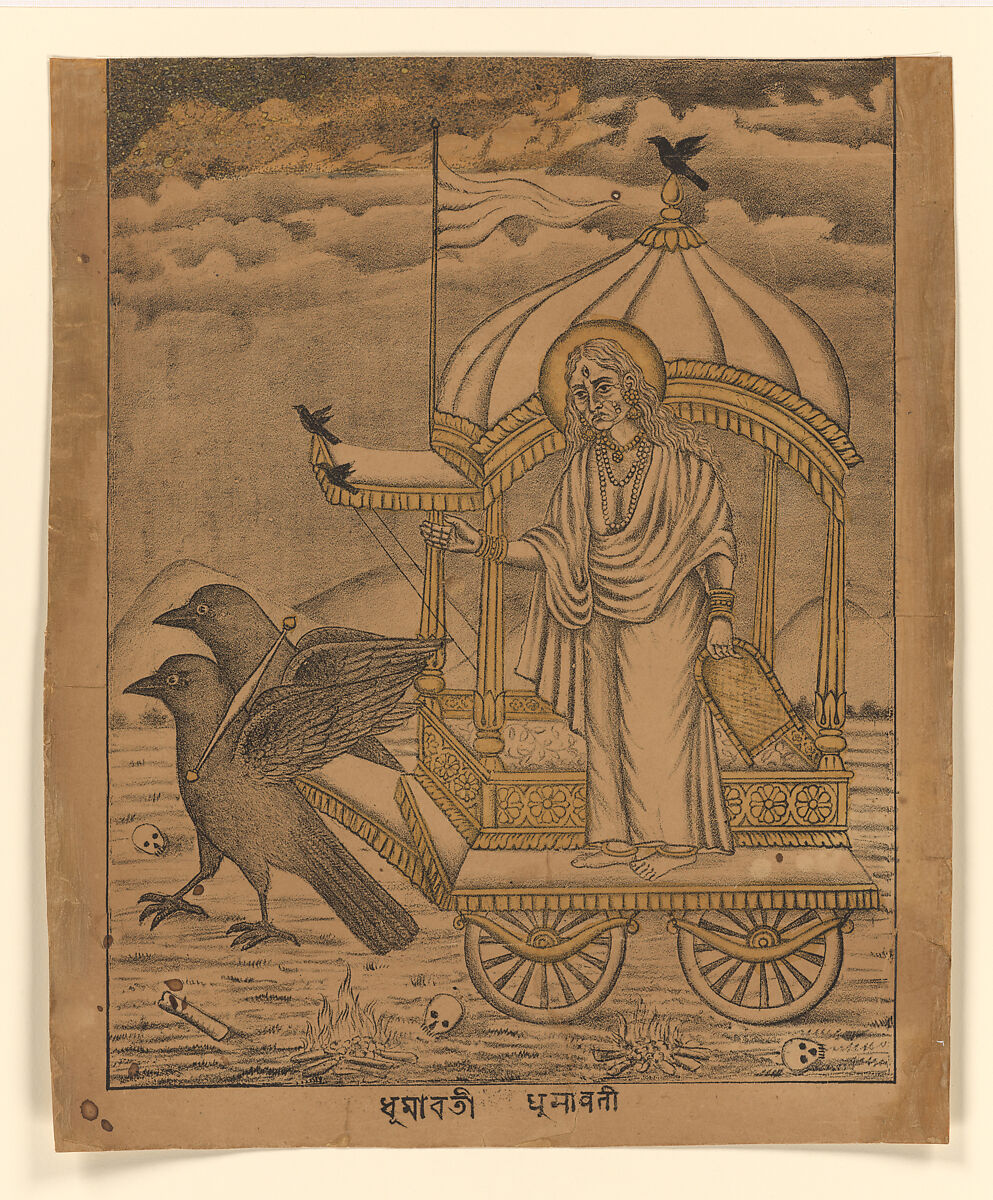 Dhumavati is one of the Mahavidyas, a group of ten Tantric goddesses of Hinduism. She represents the fearsome aspect of Devi, the Supreme Goddess. Dhumavati is portrayed as an old widow, and is associated with things considered inauspicious in Hinduism, such as the crow and the charnel grounds. Dhumavati is worshipped as one who reveals ultimate knowledge of the universe, which is beyond the illusory realms of the material world. In this early lithographic print, the image has been drawn in a monochromatic grisaille-type technique, with a limited use of color wash to highlight the golden elements of her carriage and the rice scoop which she holds in her lowered hand. A closer look at her face shows a remarkably skilled use of this technique, employing tonality and density of color to model a beautifully expressive face of an aged women of profound wisdom. Long waves of hair frame her face, and a third eye stares out from her forehead, all-seeing. Crows are her insignia, and are seen perched atop her carriage as well as pulling it.