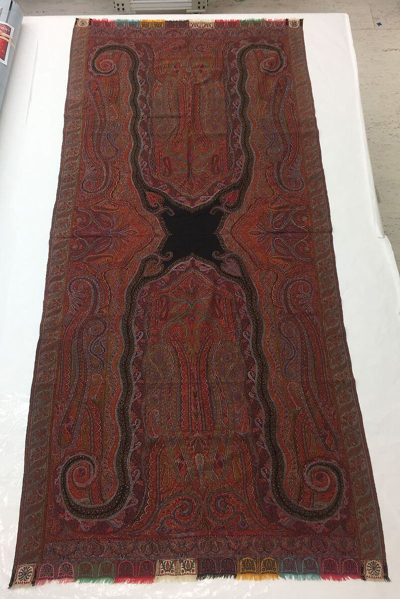 The elaborate design of this shawl is typical of the kind woven in India for the British and European market in the 19th century. While the finest Kashmiri shawls are made of soft and expensive pashmina wool (the soft under-hair of the Himalayan goat) and have designs woven on the loom, many examples from the 1830s onwards, such as this one, favored embroidery to achieve similar decorative schemes. Such a technique was easier and quicker to manufacture and thus better positioned to respond to the growing demand and market in Europe in the second half of the 19th century.
