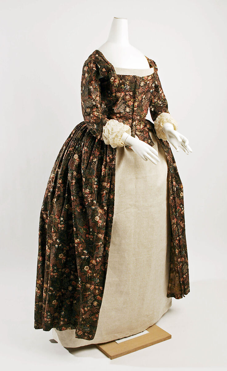 Large eighteenth-century rooms with their high ceilings could be very cold in the winter, even when a fire was blazing on the hearth. English ladies wore quilted petticoats to fight the chill and continued the fashion out of doors during the cool days of spring. These petticoats, sewn in brightly colored silks and stains, were elaborately quilted all over in fanciful patterns, not just in front, where the overdress was drawn away. This glazed chintz day dress is a rare surviving example of the elaborate floral chintzes loved by the English in the second and third quarters of the century.