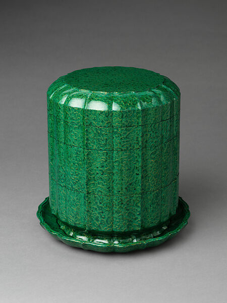 This magnificent box epitomizes the top-quality of contemporary Chinese lacquerware. Recognized in 2012 as a National Crafts Master of China, the artist, Gan Erke, has established a new standard for lacquer craftsmanship as well as reinvigorating this traditional art with new technical innovations. Preeminent among Gan’s varied lacquer styles is the marbled technique known as “rhinoceros hide” (xipi), a kind of millefiori effect achieved through the application of multiple layers of colored lacquer. Gan not only picked up this traditional craft, but also added new innovations, most notably his bold color combinations—evidenced here. The predominance green pigment together with gold foil is a color scheme for which there is no historical precedent. Rather, this represents the artist’s innovative aesthetic experimentation.
