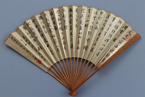 - Medium: Folding fan; ink on gold-flecked paper with carved bamboo frame
