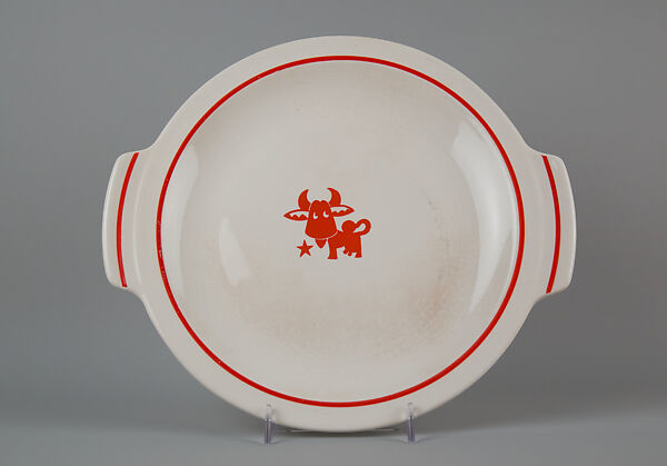 Viktor Schreckengost was a most prolific and influential industrial designer, who enjoyed a long career during the 20th century. He was literally born into the ceramics industry, in Sebring, Ohio, where his father worked at a ceramics factory. Schreckengost studied at the highly influential Cleveland School (now the Cleveland Institute of Art), graduating in 1929, and launching into a successful career, both designing and teaching. By the mid-1930s Schreckengost had already established his fame as a ceramic sculptor. He also worked as a designer in the tableware industry, and by that time had begun designing it in a modernist mode, providing designs for both the forms and the decoration. One of his most successful, was his “Manhattan” shape, with its rounded, ample, simple, and spare forms, with unornamented rims. Its very name, “Manhattan,” implies modern, urban life. The shape was conceived as a vehicle for transfer-printed decoration, allowing for new designs to be issued annually. In about 1935 the American Limoges China Company (later Sebring Pottery), where he serve as artistic director, introduced his Animal Kingdom line on “Manhattan” forms. It features various simplified animal motifs—humorous stylized designs of elephants, donkeys, pigs, squirrels, and fish, each accompanied by a carefully placed star. The designs were not hand-decorated, but rather were applied with decals. In many ways the chubby and cheerful silhouettes in vibrant colors are almost childishly naïve.